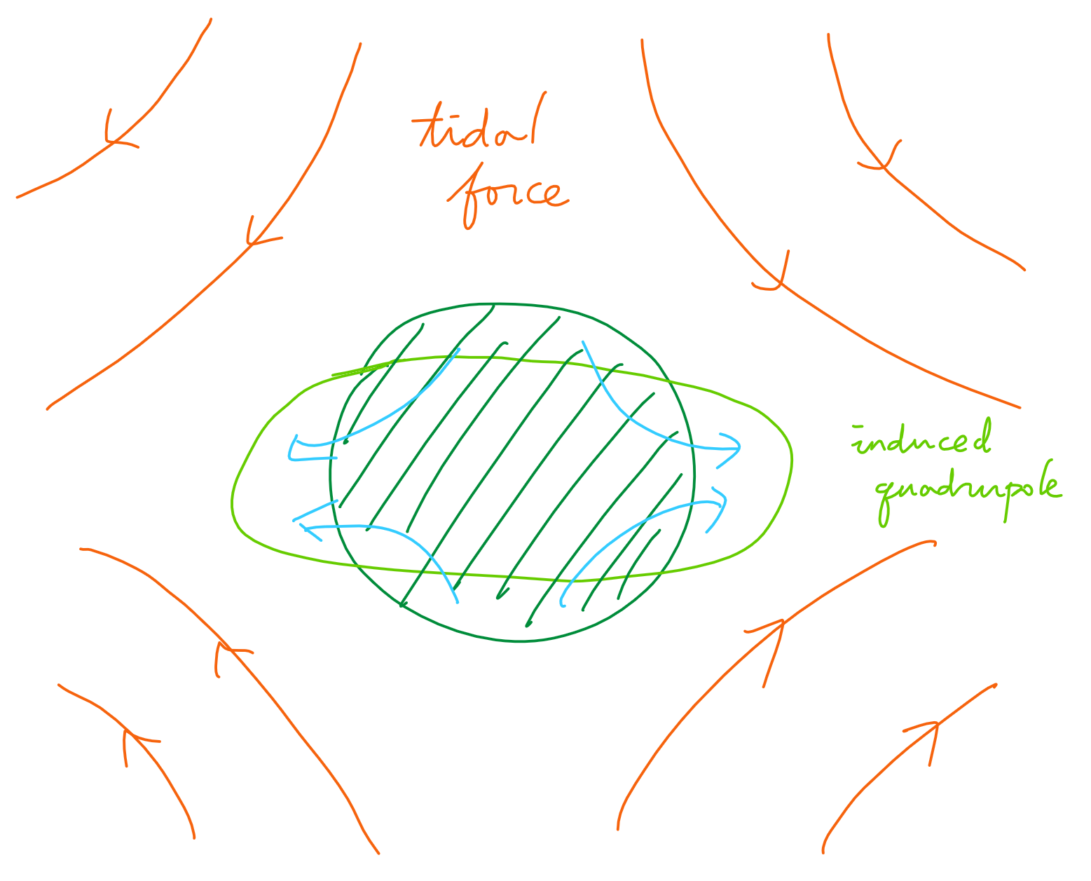 다만 우리에게 좀 더 쓸모있는 러브 수는 2종 러브 수(Love number of second kind) 혹은 러브 수 $k$로, 2종 러브 수는 조석력을 받는 물체가 중력의 원천(source)으로서 어떻게 변형되는가를 나타낸다. 앞서 잠시 언급했던 전자기학으로 돌아가보자. 전기 감수율은 (전기적으로 중성인) 물체가 전기장 안에 놓였을 때 전기장에 의해 획득하게 되는 전기쌍극자(electric dipole)를 나타내는데, 이것을 '외부 전기장에 의해 물체가 얻는 유도된 쌍극자 모먼트(induced dipole moment)'로 볼 수 있다. 다시 중력으로 돌아오면, 2종 러브 수는 외부 중력원에 의해 받는 조석력으로 물체가 얻는 유도된 질량 극자 모먼트(induced multipole moment)를 나타낸다고 할 수 있다. 편의상 사중극자(quadrupole)에 대응되는 $k_2$를 예로 들자면, 한 방향으로는 확장하고 그 수직한 방향으로는 압축하는 조석력을 받는 물체가 중력원으로서 어떻게 찌그러지는지를 나타낸다고 할 수 있다.